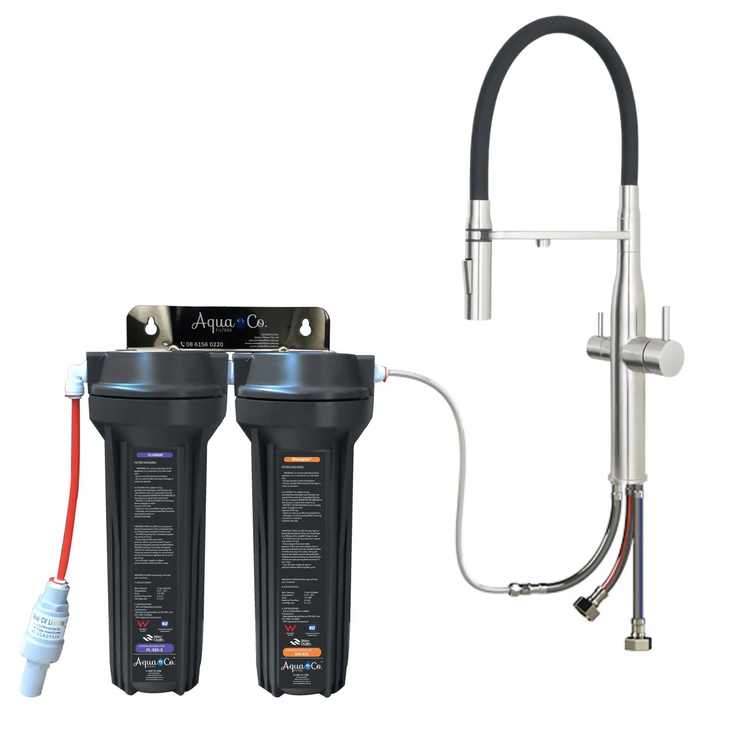3 Way Mixer Tap with AquaCo SYS-925FD Undersink Water Filter - Reduces PFAS Compounds, Chlorine, Taste, Odours, Parasites, Bacteria, Lead and Fluorides.