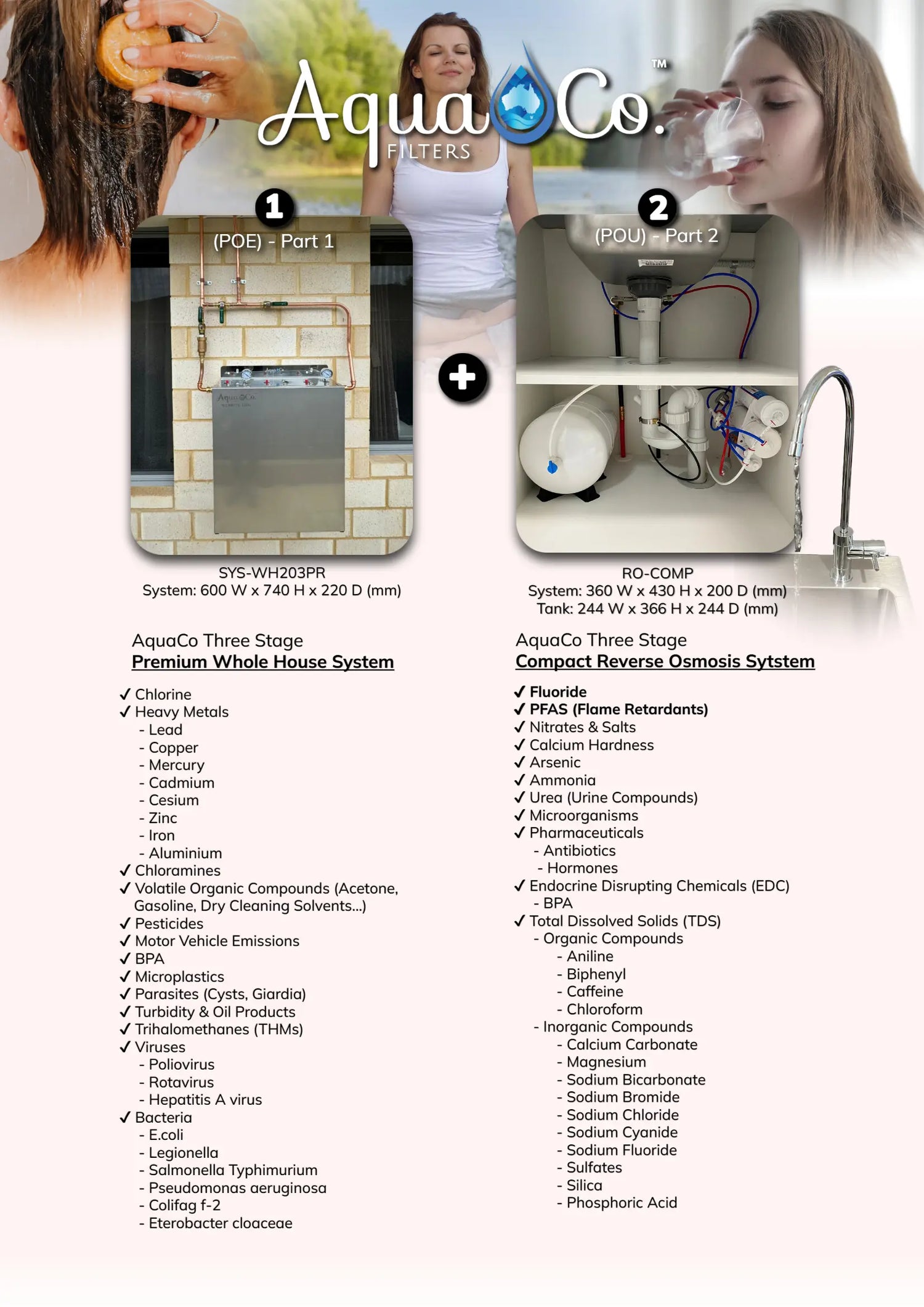Whilst the AquaCo Premium Three Stage Whole House Water Filter protects your family and household appliances from Scale Build Up, Sediments, Chemicals, Heavy Metals, and even Microorganisms, the AquaCo Compact Reverse Osmosis is very effective at removing Fluoride, PFAS, and other hard to remove contaminants found in drinking water.
