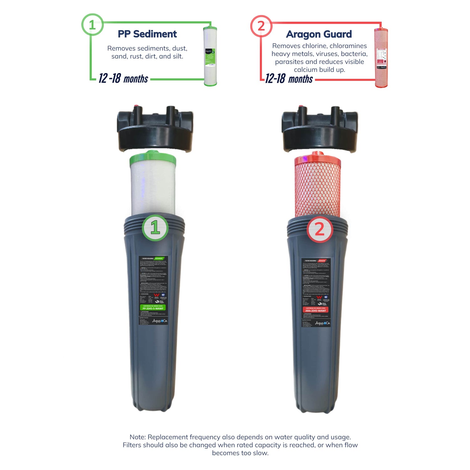 - Three layers of protection (Sediment Filter for the first stage; an Aragon Filter for the second stage; a Carbon Filter in the core of the Aragon Filter for the third stage).